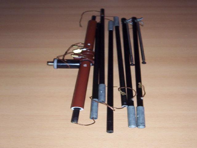 Parte desplegada y la otra ya unida - Extremo telescopico retraído La antena cuenta con dos juegos de bobinas: