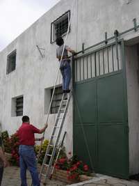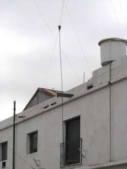 A mi regreso, extendimos los dipolos, armamos el mástil con la "Jota, Palo de escoba" para la banda de 2 metros, y aprovechando el portón y una ventana, lo pudimos instalar logrando una altura de 12 metros. |