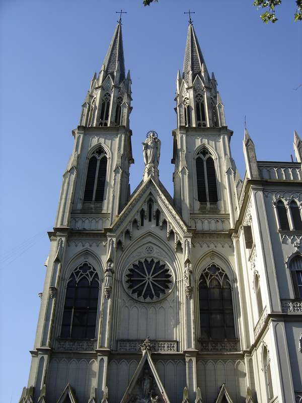 El edificio que alberga a la Parroquia Inmaculado Corazón de María, ha quedado a un lado de la plaza Constitución; un lugar donde convergen no sólo las líneas ferroviarias sino también colectivos y taxis. Otros Servicios y dependencias han sido también emplazados allí, a lo que se suman las autopista y el distribuidor de tránsito en la avenida San Juan. Todo esto, ha dejado que la vista de esta basílica neogótica sólo pueda apreciarse desde su frente, aunque también se halla bastante obstaculizada por los árboles. Hechas las aclaraciones que justifican en algo las malas fotografías obtenidas, sólo resta mostrar algunas de las vistas de esta magnífica construcción. |