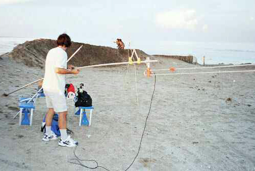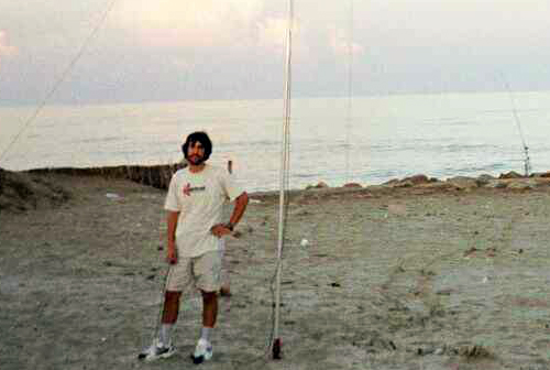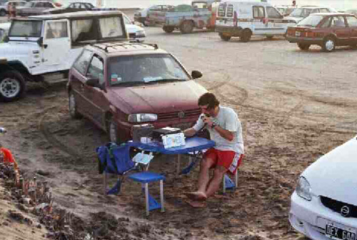 Una delgada playa y la calle de acceso separan unos 100 metros el mar de la "boca"; Qué mejor lugar para activar esta laguna ? . Sobre la parte alta de la playa y ante la sorpresa y curiosidad de los bañistas y pescadores, colocamos la mesita plástica con los equipos, instalamos el mástil, izamos el dipolo, colocamos el estandarte del Club .... y a llamar CQ !!