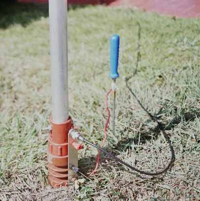 El mástil descripto hasta aquí, sirve como accesorio para el montaje de antenas, pero la idea era que también pudiera utilizarse como un irradiante vertical; para lo cual adapté en el extremo inferior de unos 35 mm. de diámetro, una pieza de polipropileno de instalaciones sanitarias y un aislador industrial. El conjunto además de una base resistente, brinda al mástil de una perfecta aislación del suelo, y sobre una planchuela de acero inoxidable fijada a la base, coloqué un conector UHF, un par de bornes del tipo fuente y un bulón de 1/4' con mariposa que sirven para conectar directamente un cable coaxil, una línea abierta, los radiales de plano de tierra y/o la jabalina de puesta a tierra.