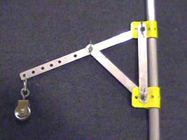 Pero el accesorio más interesante lo constituyó un mástil telescópico formado por 4 secciones de caño de aluminio, concéntricas, de aproximadamente 2 metros de largo cada uno, con perforaciones transversales cerca de los extremos que permitía trabar las secciones una vez extendidas, alcanzando una altura de 7,5 metros desde el plano de emplazamiento. La sección superior, de unos 22 mm. de diámetro, tiene la rigidez suficiente como para sostener la antena Slim-Jim de VHF con su brazo soporte y una percha con roldana para poder izar un dipolo. La mencionada percha, está formada por tres planchuelas de aluminio con diferentes perforaciones que permiten modificar la posición de anclaje según se prefiera y se fija al mástil por medio de 2 abrazaderas realizadas con cintas de PVC flexibles, recuperadas de un sillón de jardín de desecho, y tres tornillos de 1/4' con mariposas y el remate de una pequeña roldana en el extremo.