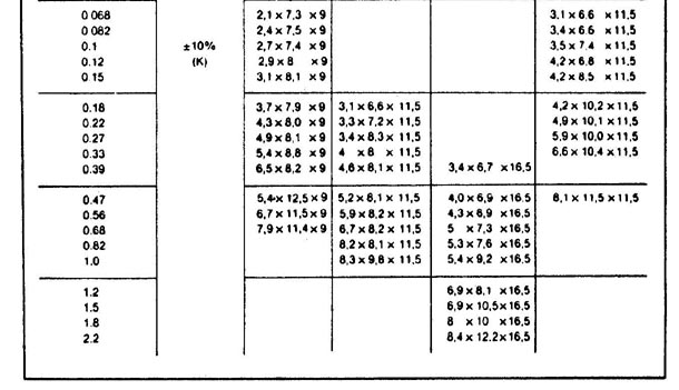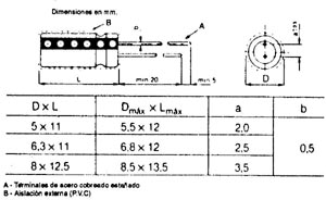 El mismo también es válido para capacitores de otros tipos. Las dimensiones dependerán básicamente del tipo de capacitor, del valor y tensión de trabajo, es conveniente que el proyectista posea algunas tablas como las que siguen.