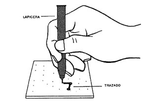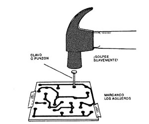 Con el clavo o punzón marcamos los puntos que corresponden a los agujeros por donde van a pasar los terminales de los componentes. Estas marcas, obtenidas con un golpe no muy fuerte, servirán de guía para la copia del dibujo, como muestra en (b) de la misma figura 4.