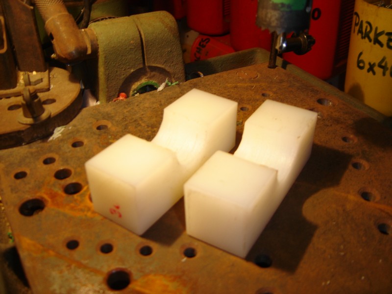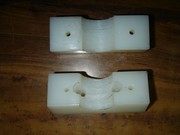 Para la realización de las piezas de reemplazo, partimos de una barra de Nylon, de 30 x 30 mm. Si bien no es el material más apropiado ( Teflon hubiera sido optimo ), es mecánicamente resistente y elástico, algo preferible a la rigidez del material de los soportes originales, que termina siendo quebradizo. Para el reemplazo de los soportes, de debió replantear la forma de fijación, ya que los originales cuentan con roscas insertas en el material, que no sería posible replicar en el nuevo material, por lo que se decidió realizar piezas de 90 mm. de largo, las que superarían el ancho de los soportes originales para poder incluir sujeciones laterales, como se verá posteriormente. |