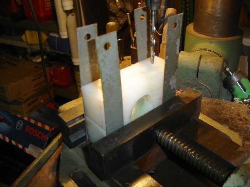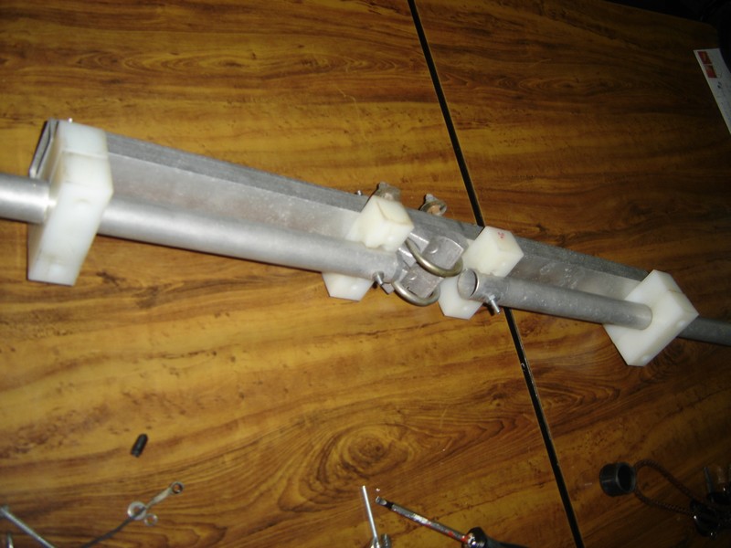 Todo el trabajo se realizó con una sierra, un taladro de banco, una morsa plana, mechas de diferentes medidas y una sierra copa del diámetro del caño del dipolo, en este caso 27 mm. destinada a formar la media caña que oficiaría de cuna de apoyo para dicho caño. Las piezas se trabajaron de a pares, fijando las mismas en la morsa, marcando el centro y realizando una perforación justo entre ambas piezas. Esta será la guía para realizar el corte con la sierra copa, que formará una media caña en cada sección. |