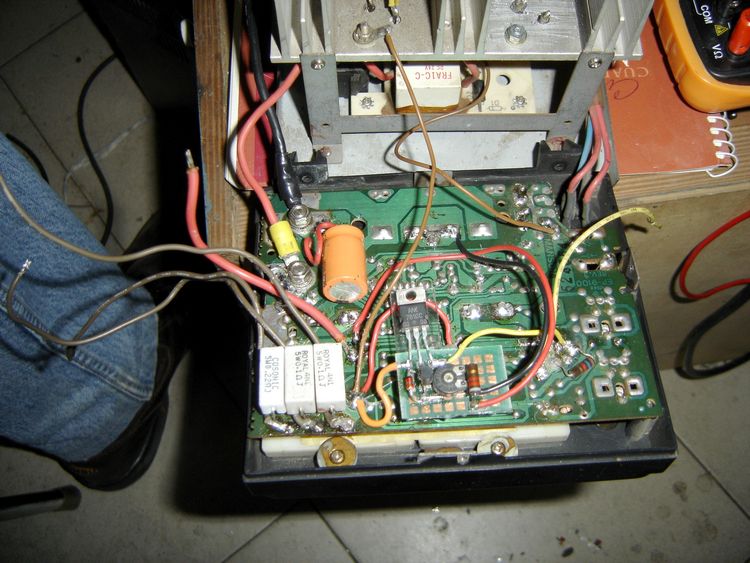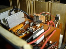 Un ejemplo de utilización de componentes disponibles y materiales de recupero de desarmes. En este caso, transistores 2N3055 con encapsulado tipo TO-247, los cuales necesitaron conectarse con chicotes para poder ser montados en los disipadores. Estos últimos, a su vez, fueron recuperados de desarmes de otros equipos, y se adaptaron para este nuevo uso. Nótese la forma caprichosa de los disipadores |