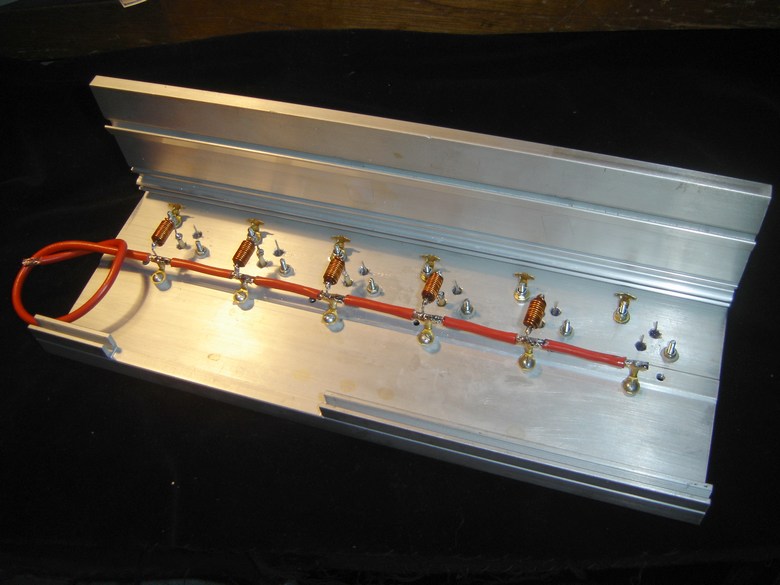 En las siguientes fotos pueden observarse las líneas mencionadas, de sección generosa, y el montaje de los resistores de ecualización en el emisor de cada transistor. Otra línea más es solidaria a todos los transistores, y es la que proviene del transistor driver (el sexto de la serie) que une a las bases de los 5 transistores finales. |