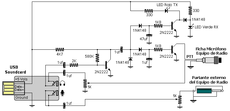 PTT por VOX alimentado desde puerto USB Ya se mencionó en la nota de Interfases Digitales la posibilidad de accionar el PTT utilizando la función VOX del propio equipo de radio, e incluso se incluyó un circuito VOX para aquellos que no la tengan disponible. En el caso de circuitos sin alimentación externa, para provocar el disparo del circuito, es necesario un nivel de audio considerable al que algunas placas de sonido no alcanzan. Por otro lado, los circuitos más elaborados, con alimentación externa, solucionan el problema del accionamiento con bajos niveles de audio, pero complican el cableado y las conexiones. La solución mas aceptable para alimentar un VOX es tomar tensión del puerto USB, donde están disponibles + 5 Volts y el cableado se reduce a una ficha más, que habitualmente se encuentra cerca de las salidas de audio. |
