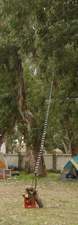 Retiramos los separadores hasta donde la línea no había quedado desalineada (perdón por la redundancia) y preparé una tabla con un sujetador en un extremo, y marcas equidistantes para ubicar los separadores. Este sistema, resultó bastante efectivo, y los resultados fueron satisfactorios, aunque me gustaría mejorarlo, y ya tengo pensado otra solución para el próximo intento. Con la línea terminada, armamos el resto del dipolo, usando las partes de uno comercial, al cual se la había roto la línea del tipo ventanitas y un par de días después, la colgamos para probarla. El resultado, increíblemente nos dió casi un 1:1 de ROE en la banda de 40 metros, igual que la anterior. Obviamente habría que alargar las ramas del dipolo y/o la línea de bajada, para lograr el clásico dipolo G5RV resonante en 20 metros, pero considerando que la banda de 40 metros es mucho más utilizada por nosotros que la de 20, la dejamos allí, sin más modificaciones. |