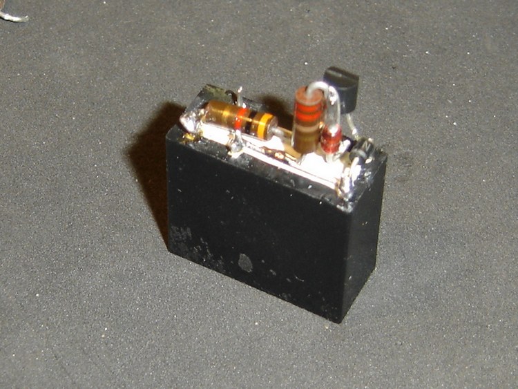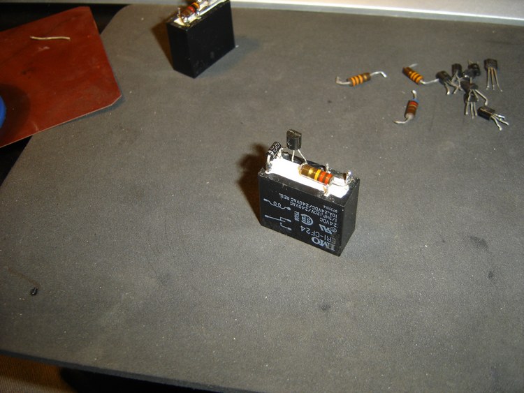 Un paso a paso de armado de la protección sobre un mini relé. La protección esta destinada a una fuente de 10 amperes, y el primer resistor que se suelda está destinado a facilitar el armado, proveyendo un soporte para la masa del circuito. El valor de dicho resistor no es crítico, e incluso podría usarse un capacitor que oficie de puente aislado. El relé, como varios de los componentes, fueron obtenidos de circuitos de rezago, dado que casi ningún valor es crìtico, a exepción del Zener de 15V. |