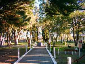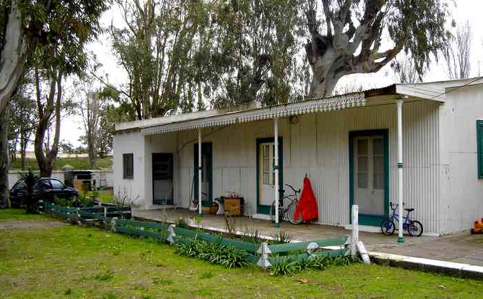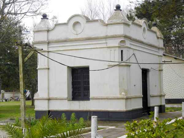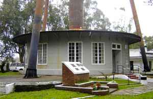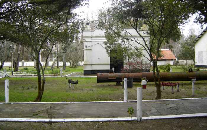 Otra vista del depósito y la vivienda del personal de Hidrografía. Sobre el parque, una de las patas originales del faro, que han sido reemplazadas recientemente. |