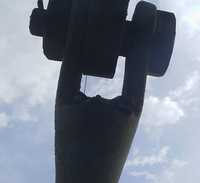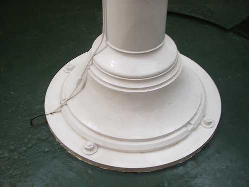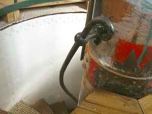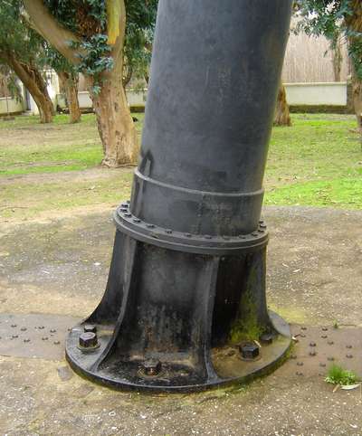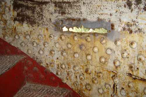 La cara interna del tubo principal del faro muestra las reparaciones que se están realizando; tanto de obturación de las perforaciones de la chapa, como el rasqueteado y preparado de la chapa que próximamente será pintada. |