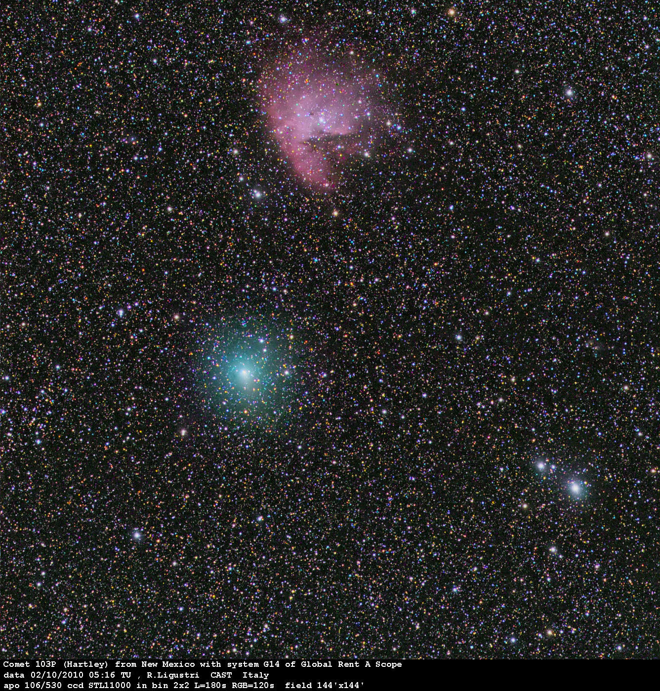 El Cometa Hartley 2 (103 P/Hartley 2) continúa acercándose a tierra para un encuentro de cercano de 11 millones-millas el 20 de octubre. Aunque todavía no es visible a simple vista, los astrónomos aficionados lo pueden encontrar fácilmente utilizando telescopios del tipo amateur.