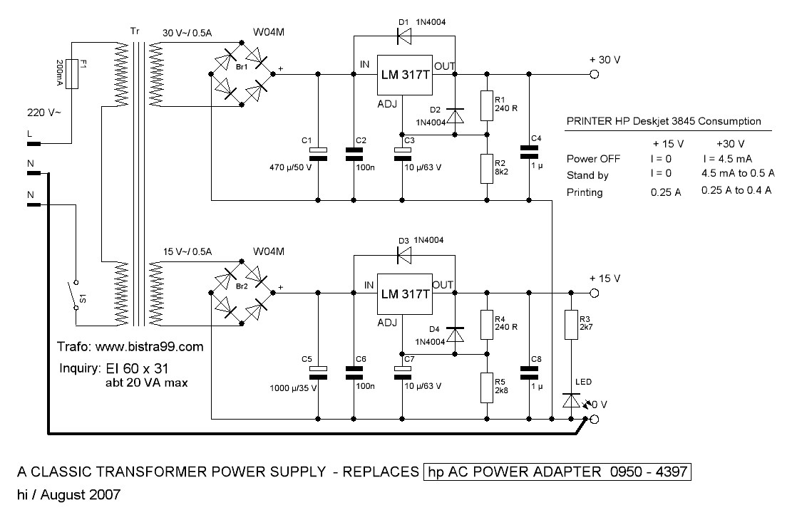 Всичко това означава, че за двойно по-високата мрежа 220V~ (220=2x110 :), работното входно напрежение просто също трябва да е двойно: т.е. поне 260V~. До тук разказах, как си открих два фронта (при един общ враг :). На първия фронт успях да захраня и пусна в действие принтера си. Това направих, като свързах в серия два лабораторни токоизправителя (2 х 15 V). По-късно си поръчах трансформатор от фирмата "Bistra99" на адрес _http://www.bistra99.com и по първата схема събрах захранващия блок, който виждате на снимката. Най-трудната част от упражнението се оказа конструктивното оформление, но като цяло захранващия блок стана добре и изглежда достатъчно професионално. Не съм имал за цел постигането на минимални размери(обем), защото за направата му използвах универсални монтажни плочки и дистанционни втулки от една моя стара, но неувяхваща разработка: П.Хинков "Универсална модулна система за радиолюбителска радиоапаратура" (описана е в сп. Млад конструктор, кн.2, 1979 г., а също така и в книгата на инж.Д.Рачев - "Лаборатория на Hi-Fi любителя", София, 1989, Държавно Издателство "Техника"). По време на дейността ми по направата на захранващия блок, един трансформатор на фирмата "ANG" (видях го в Conrad), с типова мощност 18 VA и две отделни вторични намотки по 15V / 0.6A - ме наведе на идеята, която виждате на втората, приложена тук схема. Всъщност, първоначално докато бях изправен с "гръб до стената", (в първите дни след аварията), аз захранвах принтера си именно така - с помощта на два отделни токоизправителя, тъй като това беше и първото, което ми дойде на ума.