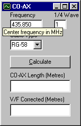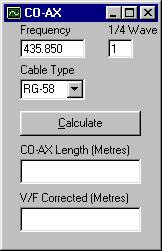 | The top box shows the length of a quarter wave (x the number entered) for the entered frequency with air as a dialectric. The second box shows the Velocity Factor corrected length for the choosen type of co-ax. If the co-ax type you are using is not shown, use another with the same velocity factor, or email me and I will add it to the program. |