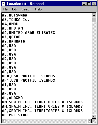 | Using a text editor (Notepad or similar), open the location.txt file that was zipped up with the Prefix program. If using Notepad, you will be presented with the following screen, |