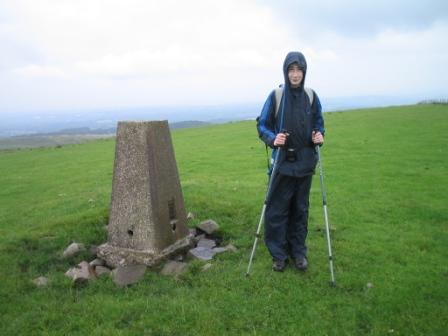 The walking along the track on the crest of ridge was a real tonic. At last, we were away from urban civilisation, the feel of which extends into Lyme Park with its "family day out" marketing approach. Yes, we were back to wild remote upland walking as enjoyed on the Pennine Way last year. Not as wild or remote, or indeed 'up' as the Pennine Way of course, but certainly a return to the sense of being away from it all in the countryside. The triangulation column at the summit of Sponds Hill required another mini-diversion, fifty yards or so to the right of the path, although the viewfinder point further down the path is at the same height according to Ordnance Survey. Whatever, it was the summit, the highest point of the whole Gritstone Trail - and attained by early afternoon on the first day! It would be all downhill from here...?