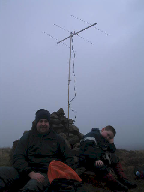 Probably overexcited, the boys didn't sleep too well on their first night in Ireland, but they were still made to get up at 6am sharp on the morning of Wednesday 30th March 2005, Jimmy enthusiastically, Liam a little less so. The flask was filled with my father-in-law's homemade chicken and vegetable soup, and we set out to the main street in Larne, and Apsley's Newsagent and Cafe - for an Ulster Fry. For the uninitiated, an Ulster Fry comprises bacon, egg, sausage, tomato, beans, soda bread, potato bread and fried pancake. We washed these down with glasses of fresh orange juice and drove out of Larne on the A8. We turned right onto the A36, signpost Ballymena, but realised when we reached the road summit of Shane's Hill that we had missed the turning. Nonetheless, a 3m band DXing session was in order from this location, and the border station WILD Country was heard as well as new IOM station 3FM. We drove back down to Kilwaughter, and took the minor road heading NW. Just beyond the highest point of this road, we pulled into a boxed space for one car on the side of the road (also used in 2003) and strolled down to the large stile signposted "Ulster Way". Unlike Divis, this section of the Way is fully open, and we followed it over boggy ground up the gently rising hill. Only after the stile over the fence near the top does any kind of distinct path begin to form, and this leads to the summit cairn of Agnew's Hill GI/AH-005.