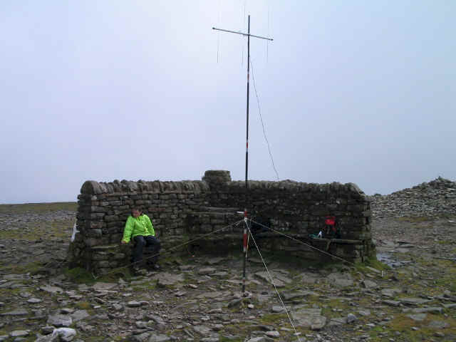 This summit was activated on Saturday 6th September 2003 by myself accompanied by Jimmy & Liam. This marked a first 'six-pointer' for the boys, and indeed was Liam's highest summit to date. Having taken the decision not to attempt to get a second summit in later in the day (wisely as it turned out), we opted for the shorter route from Ingleton, although this does require around 50m extra of ascent compared to the popular path from Horton-in-Ribblesdale. We parked in ample space at the roadside by the start of the path in Ingleton, and followed the good path along the 2.5 miles to the summit. For about half of the way, this was an easy gently climbing land rover track, until we reached the farm. From then on, it was a good stone typical mountain path, and the gradient became gradually steeper until finally there were three sharper climbs up stone stairways (all "false summits"!). Between a couple of these, I heard fellow SOTA activators on S20 on my little 230mW Standard C108 handheld that I use for monitoring during ascents and descents.