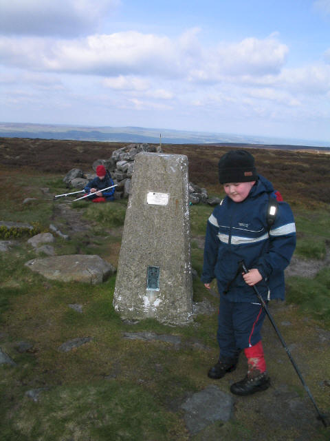This was my third time up here, but a first for Jimmy and Liam. We headed out of Skipton on the A65 towards Ilkley, then turned right (south) to get to Silsden. From here, it was just a case of following my nose and memory, and without too many false leads we found the road signed "No vehicle access after 1.75 miles" or words to that effect. We parked here in the large space bny the transmitters, and set off through the gate and over the moor to the trig point. This was the only boggy one of the day, with the earlier two being refreshingly bone dry. Still, it was an easy 20 minute horizontal walk in, and we were soon at the large cairn and trig point. This was the only summit of the day without shelter, but thankfully the wind had considerably dropped by now.