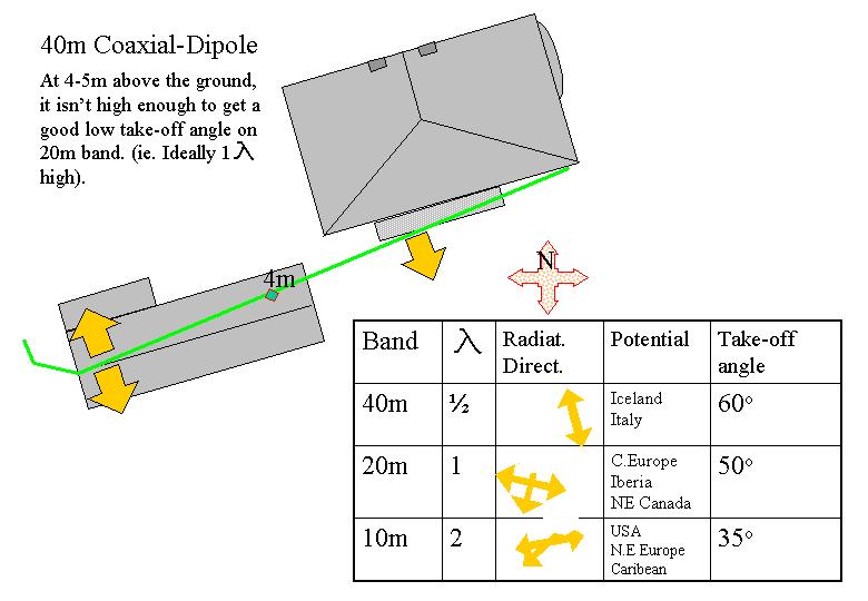 At max 6m and average 4.5m above the ground, it isn't as high as I would like it but I have had to compromise to maintain XYL relations! The house wall runs about 1' away from the antenna for some of its length and on the other end it has to dive down to 2m with a 230 degree bend in it! Consequently, although being designed for 40m and having a reputation for low SWR and being broad-banded, I found I couldn't get a reasonable SWR from it. The Z-match ATU, however, has allowed me to tune up this antenna and get good results from my 10w - eg. PY2VA Brazil on 15m, ZP2MAL Paraguay on 12m. Tuning with the Z-match is easy and I'd advise everyone to build one, they're so easy to build and use - I can get a SWR down to practically 1:1 on all HF bands except 160m. 12 and 17m are very easy to tune, 15 and 40 are easy, 20 and 80m are more difficult because as you retune the radio across these bands you have to keep adjusting the ATU. However this isn't all the story, ease of tuning on the ATU is all for the radio's benefit, it doesn't necessarily give you a good balance on the antenna feeder. Checking for stray radiation, I found that 12-20m are fine yet 40 and 80m radiate badly all the way down the feeder and in the shack. This was a real surprise on 40m, the band it was designed for. 17m though is perfect which is interesting when you look at my log, the higher frequencies also cope better with the relatively low height of the antenna giving a lower take-off angle helping with DX of course!