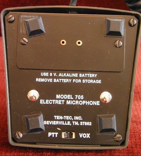 The Ten-Tec Model 705 is an Electret desk microphone designed for use as a station microphone in commercial and amateur radio communications and in public address and paging installations. The microphone consists of a base section and flexible gooseneck mounted microphone. The Model 705 incorporates a momentary type Push-To-Talk (PTT) button (gray), a Push-On, Push-Off locking type button (black), electronic circuitry to switch the microphone on, a signal amplifier that adds 13 dB of gain to the output level, an attached output cable and a battery compartment for a 9 volt alkaline battery. The PTT circuitry allows switching transmitters and/or transceivers, that have a low voltage positive T/R lines, into transmit mode. A light emitting diode in the base signals the transmit mode.