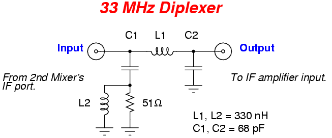 Ahead of the IF amplifier (on the 2nd mixer's IF output) is a circuit called a diplexer. Wideband frequencies (and noise) exiting the 2nd mixer at the IF port will "see" a dual-path at the junction of L1 and C1. Frequencies higher than 33 MHz follow C1 and get absorbed by the 50 ohm resistor load. Frequencies lower than 33 MHz follow L1 and are sent off to the IF amplifier stage. This circuit gives the mixer a constant 50 ohm impedance over a very wide frequency range, reducing the chances of intermodulation distortion. The diplexer can be easily redesigned for any crossover frequency point.