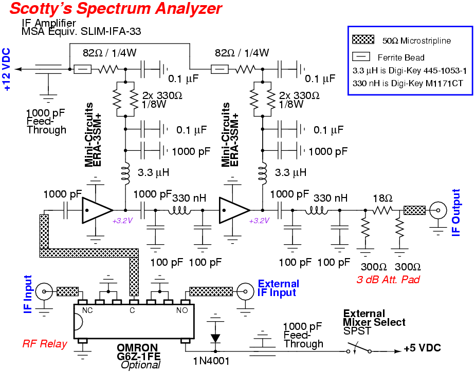 The IF amplifier module consists of two separate Mini-Circuits ERA-3SM+ MMIC amplifiers with a common +12 VDC power input connector. The MMICs have a bandwidth of over 4 GHz, so a 40 MHz low-pass filter is included in each output. Scotty's original design used Mini-Circuits ERA-33SM MMICs, but ERA-3SM+ MMICs are easily found on eBay.