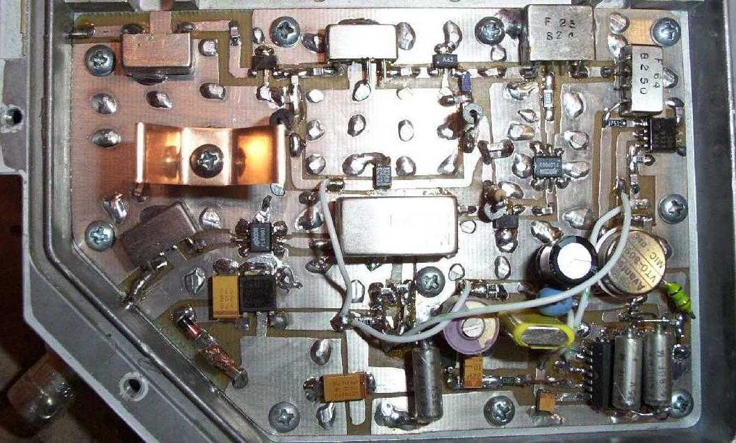 Tracking generator internal view. Sweep input is input via the top N connector and is isolated by a 3 dB attenuator. RF output is via the side BNC connector and is also isolated by a 3 dB attenuator. VCO and PLL is in the lower right.