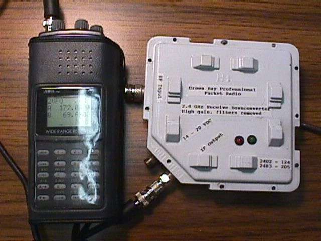 The 2.4 GHz receive downconverter hooked to an AOR-8000 scanner. The converter is a slightly modified high-gain MMDS downconverter. The sharp bandpass filter on the RF input was removed, and on the IF output, the amplifiers and filter were removed. What all this does is to allow incoming signals (2.402 - 2.483 GHz) to be mixed with a local oscillator frequency of 2.278 GHz and converted to a much lower VHF frequency. Example, a 2.45 GHz signal will be output as a 172 MHz signal (2450 - 2278 = 172). This allows us to quickly verify the integrity of the 2.4 GHz ISM band using a conventional communications receiver (scanner) to step through 124 - 205 MHz.