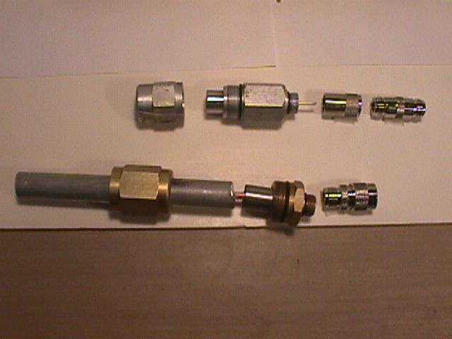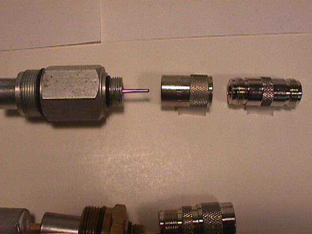 Select a picture for larger image.These are the kinds of connectors that clamp to the outer shield and center conductor, have O-ring sealants, and have an extra long center pin. The outer thread is the same as the thread used on PL-259s and N jack connectors. What you want to do is cut the center pin on the hardline connector to the proper length to fit inside a N jack to N jack barrel adapter or just a coax jumper with a N jack. You can then use the cutoff outer shell of a PL-259 to secure the connection.