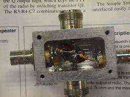 Insides.  The yellow wires are gimmick capacitors used to tune the bridge.  This version has a 51 Ohm resistor soldered in for the reference termination.