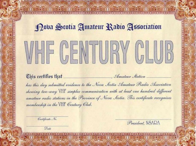 This award requires VHF contact on SIMPLEX with ONE HUNDRED Amateur radio stations in the province of Nova Scotia. Contacts must be logged on the forms provided, but no QSL cards are required.