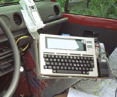 | Icom IC2SAT, Kantronics KPC-3, Tandy Model 100, Garmin 45 GPS in my Samurai. | more pix here | |