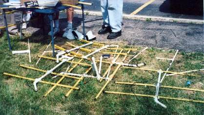 I built the one you see here using a 1-inch wide tape measure for the elements. You can probably also make the elements from a 3/4" wide tape. The ubiquitous 1/2" wide tape would be a little too narrow and too flexible to keep 2 meter elements straight as you walk along, but I've heard that some Hungarian foxhunters in serious international competitions have used DOUBLE and TRIPLE THICKNESSES of 1/2" tape for the centermost portions of their elements, with good success. This gives them a good combination of rigidity and flexibility as they run (yes, run) the course looking for the hidden transmitters.