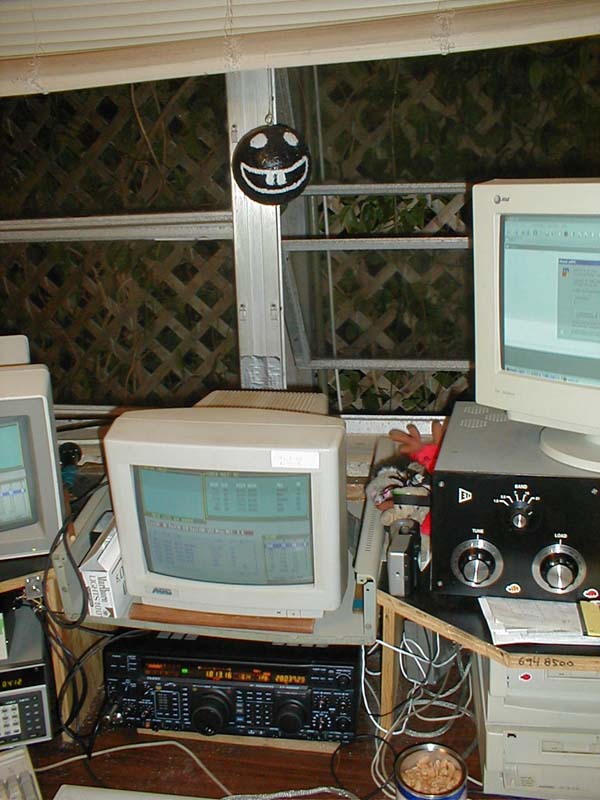 Here are two pictures Paul took of me (N2NL) operating the 2002 January NAQP CW contest. I prefer using two computers when operating SO2R because it makes the whole operation much simpler and easier. I find it much easier to be able to enter a call sign on the 2nd computer, enter the info, and leave it until I'm able to work it (if I'm running on the primary station). I prefer to listen to one radio in each ear rather than mixing audio which confuses me. I can't do it with SSB yet, but with CW I can copy and understand separate call signs and basic QSO information in each ear independently. I learned how to do this by practicing during the NAQP contest which I consider as one of the easiest contests to learn SO2R since CQing frequencies usually aren't that difficult to find, unlike CQWW where you can lose it in a heartbeat.