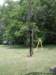 Close-up view of the HAM-M rotator and antenna-to-mast mounting. Also note (on the left guy) that it is attached to the launcher using a section of threaded rod. This is because I wanted to use three guys instead of four as the top of the launcher was designed for.
