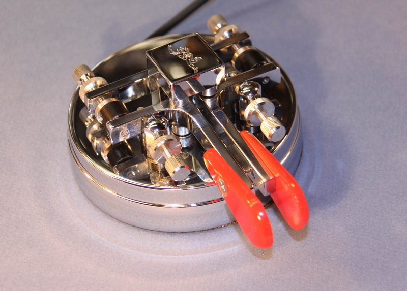 This is Rich's (KG2ED) version of the famous N2DAN paddle, S/N 041. Rich also included a set of mother-of-pearl fingerpieces, but the red and chrome always looks good. Rich calls this the "Long Island Mercury Paddle."