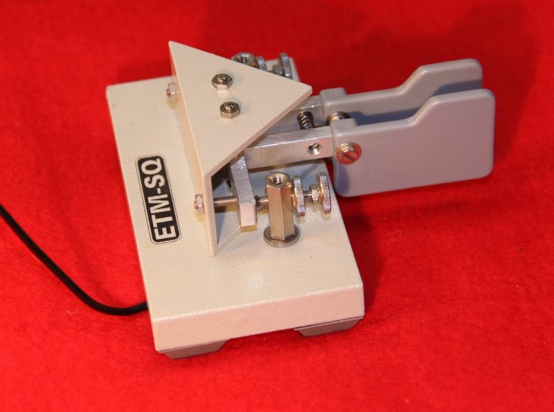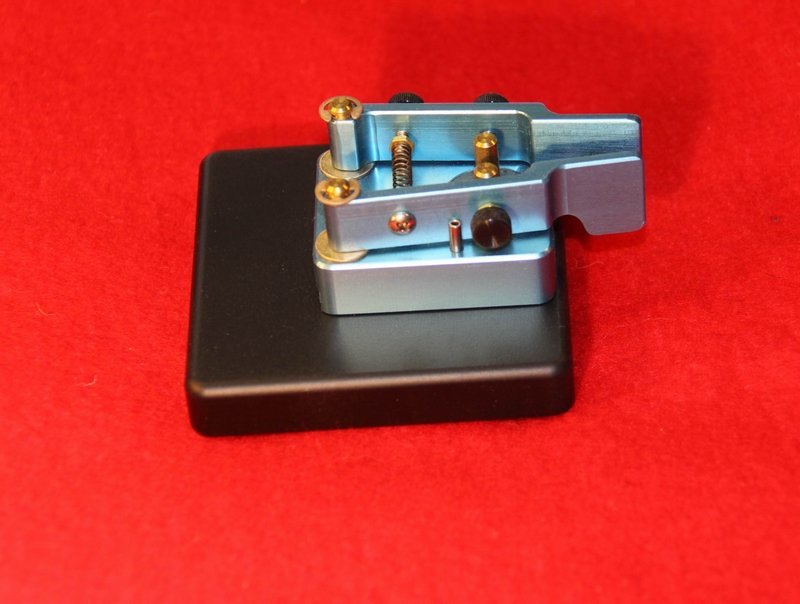 This is a Porta-Paddle, made by Doug, W6AME (American Morse Equipment). It's mounted on the optional powder-coated base. The paddle is actually their first version of the Porta-Paddle; I like the looks of this one better than the "II" version. It's CNC-machined from aluminum, then blue anodized.