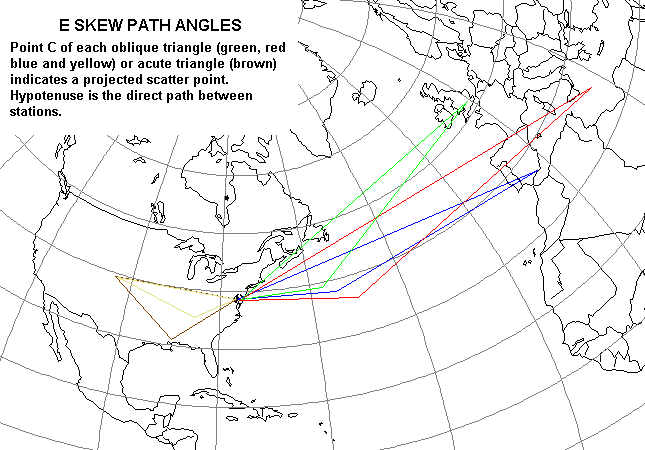 | The fact that Dave was also hearing Tennessee, North Carolina and South Carolina stations on this indirect path may also imply the skip zone was a bit further to the North and East than the map indicates. W6OAL was copiable for me on every heading within the shaded angle on the east side of the map. However, all attempts to recieve a signal to the North or South of this zone were futile. Aside from the skew itself, what our respective observations have in common is the reception of signals from Tennessee. Both of our paths crossed at least a part of that state directly, though for W6OAL even these signals were a bit skewed. North and South Carolina stations, which I could not hear but were on a direct path for me, were also skewed for W6OAL. Thus, the fact our paths directly crossed the Georgia, Alabama and Louisiana regions leads me to believe the scatter point was somewhere in this area. Does it really matter? Given the contact was on Es, probably not, but then again it could help to predict how one could use known active Es clouds to intentially seek out similar contacts off the direct path. One may consider this type of contact to be a product of FAI, but I disagree. Field Aligned Irregularities are said to be marked by a sometimes extreme doppler shift, and also a TEP-like flutter. I did not notice such an effect here, and indeed have not with many other skew contacts I have had on Es. Instead, if not a simple reflection off an Es hotspot, these contacts can be explained as a form of Es side-scatter, where multipathing at the midpoint sends at least part of the signal off at an angle to be received by a station a suitable distance from the hotspot. In essence, an E layer version of F2 sidescatter. This was the most acute-angled long distance Es skew QSO I have had thus far, presuming of course that the propagation followed the central or southern portion of the projected path. It is possible however that the the skew occurred along the northern edge of the projection, and it might make more sense to assume it did, as virtually all other multihop Es skew I have worked seemed to involve a more obtuse angle between the intersection of the respective beam headings. | ||