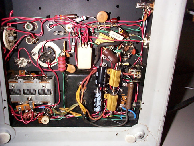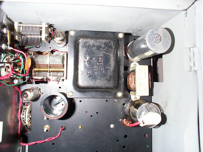 This homebrew xmtr uses a 5763 tube driving a 6146B final. The rig puts out about 45 watts a peak load. The rig is usable on the 40 and 80 meter ham bands using plug in coils. I will get a few more pictures of the rig posted soon, along with a copy of the schematic. This was a fun project and still has further additions and improvements. Next build step; build an internal VFO, paint and label the cabinet. By the way, I bought a supply of war surplus FT243 Xtals and hand ground them to make them usable on the ham bands. Look for an update on xtal grinding in a future web page.