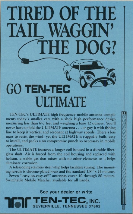 The ULTIMATE series lower section is a fiberglass enclosed loading coil. The upper "stinger" is a stainless steel, taper ground whip. The whip is vertically adjustable for tuning. The overall 78" height allows use without a spring and clears most overhead obstacles. The overall profile provides low wind resistance and, as a result, less tilting and de-tuning. Uses 3/8" x 24 mount.