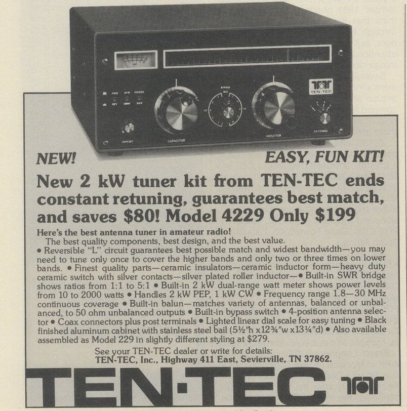 Reversible "L" circuit. Features ceramic insulators, ceramic inductor form, heavy duty ceramic switch with sliver contacts, and silver plated roller inductor. Built-in SWR bridge shows ratios from 1:1 to 5:1. Built-in 2 KW dual range watt meter shows power levels from 10 to 2000 watts. Handles 2 KW PEP, 1 KW CW. Frequency rante 1.8 - 30 MHz continuous coverage. Built-in balun - matches variety of antennas, balanced or unbalanced, to 50 ohms unbalanced outputs. Built-in bypass switch. 4 position antenna selector. Coax connectors plus post terminals. Lighted linear dial scale for easy tuning. Black finished aluminum cabinet with stainless stell bail - 5-1/2" H x 12-3/4" W x 13-1/4" D. Also available assembled as Model 229 in slightly different styling.
