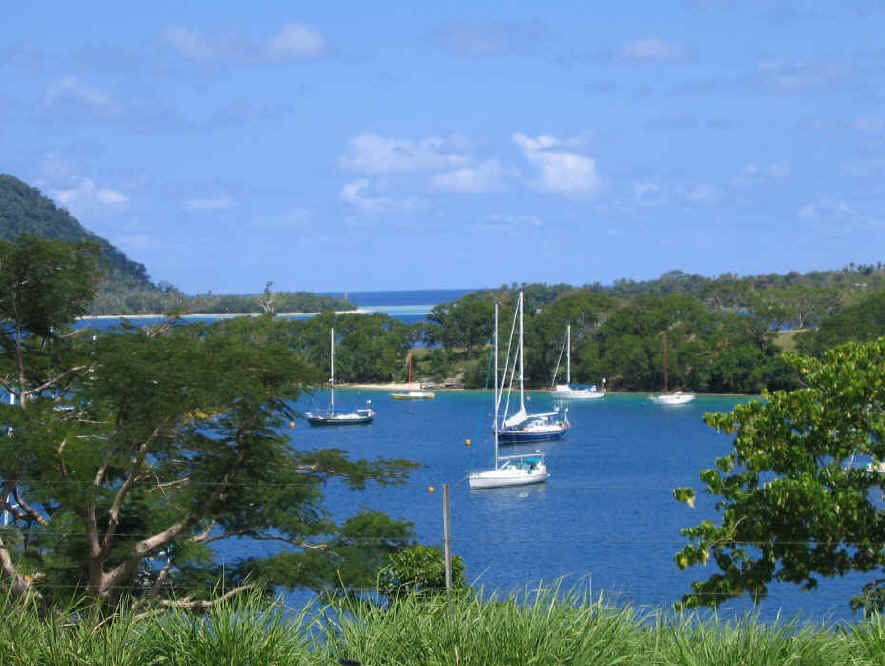 Port Vila is the capital and largest city in Vanuatu. There were a several good restaurants, including Jill's American Cafe. Jill came to Vanuatu several years ago from California. She serves cheeseburgers, hot dogs, Mexican food, etc. It was a very popular place with yachties and tourists. Port Vila also had a large fresh market where locals brought their vegetables, fruits, seafood and trinkets to sell. It addition, there is an excellent commercial supermarket (we rated it an 8 out of 10 when compared to New Zealand). This was an unexpected surprise. But, it reflected the demand from the international community that resides in this mostly undeveloped country. Vanuatu (used to be called New Hebrides) became an independent nation in 1980 after years as a condominium government under joint French and British rule. Today, they receive foreign aid from Australia, New Zealand, British, French and the Chinese. The US has a large Peace Corps contingent that is making an excellent contribution to the people on the remote islands. We met several of the workers on our travels and we were quite impressed with their commitment and programs.