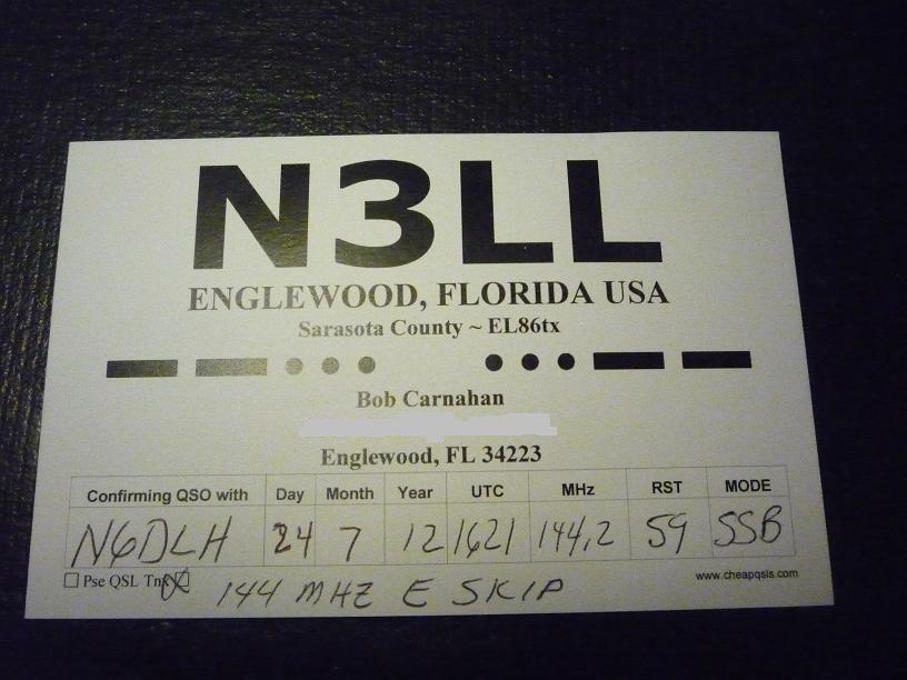 Main VHF station is an Icom 746Pro and an Arrow 4 element yagi on a tripod. I am working on extending the boom of the yagi and adding 3 more directors. I also have the Icom 706 and Tokyo high power HV-160 amp for taxing digital modes and portable operation. I plan to be portable a couple of time in the near future from FM26. I will have some QSL cards made for those contacts. It is a humble station, with less than ideal operating conditions, but I work with what I have available and enjoy the challenge. First DX contact on 2m......