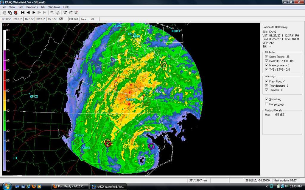 This is the radar image from a Tornado that ripped through Elizabeth city NC. The red box indicates a Severe Thunderstorm Warning The pink box is a Tornado Warning, the pink cone is what is called a Tornadic Vortex Signature, and usually will indicates the the Doppler radar system is picking up a tornado on the radar. If you notice where the signature is there is a hook that forms around the signature, this is called a Bow Echo or Bow Hook, it usually indicates there is massive rotation in the system and conditions are prime for the formation of a tornado. This one did indeed touch down and did only minor damage. Hurricane Irene 08/27/2011