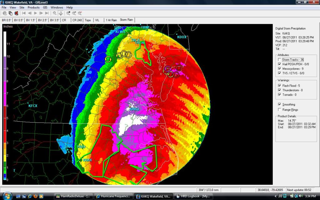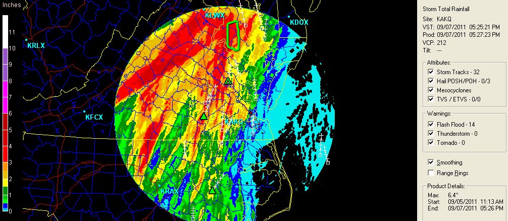 This is a composite image as hurricane Irene was hitting the coast of North Carolina and Virginia. The eyewall was making landfall on the Outer Banks of North Carolina, and the Tropical storm force wind bands were reaching up to Richmond Virginia, at this point we were still about 9 hours from being hit by the western side of the storm. Here is the pictures from several hours later, around 1:00pm EDT. The picture above is the rainfall totals at 3:30PM EDT, nearly 12 inches already! Images are thumbnail's because of size. Ruminants of Tropical Storm Lee 09/06/2011-09/07/2011