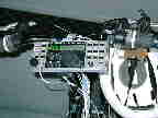 The K2 bicycle mobile project started when I got my bike and realized that I needed something to do while riding it :-). It seemed logical to put the K2 on the bike because I was soon getting the K2 SSB adapter(I don't think I can handle bicycle mobile CW just yet). It started very simple, on Saturday, March 25, I just hose-clamped the tilt bail to the handlebars. At this time I put tapped out two little mounting brackets on the back under the seat, drilled a hole through a bolt head, and screwed the antenna mount to it. (I really need a picture of this) I went out to Radio Shack and got a full quarter-wavelength 10m whip, since the bike would be most effective as a counterpoise on the higher bands. However, the antenna mounting interfered with the seat and sitting on it. So I decided to make an antenna bracket that mounted farthe back. We had some angle aluminum sitting around (it was from an antenna mount for the first AM-Digital Audio Broadcasting (DAB) research done, which took place at mt Dad's company -- he did much of the mechanical fabrication) Some of it had bent in a strong wind, but the bends were PERFECT to fit the curve of the wheel and be a bit to the side. We tried to weld the bracket at home, but our welder didn't supply enough current, so my dad later took it to work and had their machinist do a beautiful job of it. However, the radio mounting didn't look too good because the radio stuck out so far in the front. So, I thought it would be simple to remote mount the front panel. Why hasn't anyone thought of it? Probably because they are scared of RF getting into stuff, which I think is starting to happen on mine. The guys from Elecraft gave me some suggestions for this. On March 26, I hooked it up with a ribbon cable that had sockets on both ends (I used component leads in one header for pins). Once this worked on the first try, I knew I was onto something. Throughout the following week I got the front panel aluminum enclosure cut and bent. I also made up the front panel remote cable from some ribbon cable and connectors that my dad found. This was really cool, so I started working on the rest of the radio. I first thought of just mounting the radio with the rest of the case (without the front panel), and on March 26 I whipped up a quick mount out of the same aluminum angle used for the antenna mount. This proved to wiggle from side to side too much, and although wasn't uncomfortably wide, didn't look nice. Then another idea struck. Why not use the remote mounting technique to "flatten" the K2 form factor? I hacked apart various connectors, and by the end of the week on Friday, March 31, I got the K2 working with the "remote" (about 3-4" long cable) control board. I also thought to mount it on the Plexiglass sides, and started planning those and the Plexiglass mounts/side seperators. On the following Monday, the SSB option arrived, and I put it together in about four hours. The next day I cut out the mounts and sanded a smooth curve in one side so that they were touching the top tube through much of the curve. The mounts are from a piece of 3/8" or 1/2" thick acrylic that we had laying around. These are what hold the plastic enclosure at the top. I also drilled holes in the ends of these mounts and epoxied (JB Weld) standoffs in to mount them to the sides with. On Saturday, April 4, I got a sheet of Plexiglass from a hardware store, and that evening I made up a cardboard outline of the Plexiglass sides. It took FIVE tries to get the shape right, I sure am glad I made the cardboard mock-up first! When I was done with that, I marked the shape on the Plexiglass and scored it with a utility knife and straight edge. I wouldn't recommend this technique, because I didn't have the best of success. It was hard to get the knife at the exact same spot enough times, so most of the edges weren't smooth when I cracked them. I later had better success with a bandsaw, at first I thought it would crack the Plexiglass. I got one side done, and did the other the next day. On Monday I drilled the holes in the plastic sides, and screwed them together (touching). I did this because they weren't exactly the same, so when held together and sanded with a drum on the Dremel tool, they were the exact same shapes. Then when I was drilling more mounting holes in one of the sides, it cracked! I worked on mounting the K2 to the uncracked side. I got this done, and for a while, the only thing holding me up was the cracked side. On April 13, I cut slots in the bottom of the K2 front panel enclosure, ran a hose clamp through them, and clamped it to the handlebar. On the 24th, I cut out the front piece for the K2 plastic mounting enclosure with the Dremel tool, and sanded huge curves in it to (almost) perfectly fit the curve of the tubes a few inches back from where they meet the front fork bearing tube (not sure of official name). This front piece with the curves in it holds the front of the enclosure fairly tight. On April 27th, I finally got some Plexiglass cement from a well-stocked hardware store. This allowed me to fix the crack in the side as well as secure the front piece of the enclosure to its mounts. This cement is the stuff recommended for the homebrew acrylic enclosures, and it actually forms a chemical bond between the two pieces that is amazingly strong. I fixed the cracked side, and finally could progress further. On May 1, I got the front piece of the enclosure mounted. That Friday, I made the U-shaped bottom mounting bracket. This screws to the bottom tube of the bike frame with two handily provided tapped holes for mounting a water bottle. The sides have holes in them, and screws go thorugh these into nuts epoxied onto the metal mounting bracket.