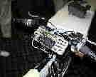 Projects page). It was actually pretty simple. I screwed the paddles to one end of a steel strip, bent it to fit the handlebar, and then screwed it to the handlebar with sheet metal screws. The paddles are immediately below the grip-shifter on the right and provide comfortable keying. It is also a rugged, low-profile design (many on Saturday night at FDIM asked if I had a key for CW). I also got to meet N9JXY at FDIM, who designed the paddles. I hurried up and finished painting on Saturday to give me time to work on the rest of the unit. On Saturday I also got a helmet to mount the speaker and mic (a small electret unit) to, and got the NiMh batteries wired in series. These batteries fit 2.1Ah into a package slightly larger than a AA. On Sunday I built a bracket for the battery pack and put the batteries in. On Monday I got the K2 working while mounted on the side cover and being keyed by the paddles. I also hooked it up to my outdoor antenna and it received. The next day, I got the batteries installed and fused, and turned the K2 on. I also mounted the microphone to the helmet. On Wednesday, I soldered the speaker to the microphone boom, and connected the mic to the K2. On Thursday (after getting back from the FDIM seminar) I hooked up the speaker and did some other minor things, including making the discovery that the SSB transmit didn't work! I moved the scope, signal generator, and FT101 downstairs to test the K2 with. On Friday I worked on the SSX TX problem again, and found that it did wierd things when connected to the signal generator! I decided to just take it to FDIM in "work-in-progress" condition. I am actually glad I did this, because it allowed more people to see it. If it would have been in the building contest, they wouldn't have been able to see it as long because the room was closed for judging purposes. On Saturday morning I woke up early (we wanted to leave for the Hamvention by 7:00), and I lengthened the speaker wires, and bundled them with the mic line. Then we taped them to the frame as strain-relief. The K2 Bike was as ready as it would be! We loaded it into the car (we had to take out the car's seat and remove the bike's front tire), and were off. After a great day at the Hamvention, we got to the QRP Hotel (Ramada Inn-Dayton Mall) at about 6:00. We waited around awhile and pulled out the bike and put the front tire back on. I rode it around the back parking lot for awhile to pass time and practice on the paddles while in motion. I finally took it in and set it up. Since I was one of the first to set up, the first people to come in came over and were amazed by what they saw. Many asked, "Where is the rest of the radio?" and some looked around for it. That was cool! Eric Swartz, WA6HHQ of Elecraft was one of the first to come in, and thought it was great. When Eric and Wayne found out I was having problems with it, they offered to help throughout the process of getting the problems worked out. I spent a couple of hours talking to everyone who had questions, and I also heard about other bicycle mobile projects. I had a great time talking to everyone. At this point most people had moved into the other room for the results of the building contest. I didn't really notice until Diz, W8DIZ, and Mary, NA6E, from the FPqrp club came over and said they needed me in the other room. I watched and listened to the other entries being judged. They were great (I really loved the set of aluminum keys and paddles)! It was fun to hear George Dobbs, G3RJV, describe everything. He sure does it like no one else! Then at the end, Jim Stafford, W4QO, (also FPqrp - #21) called me up and announced that for my work, Elecraft and QRP-ARCI had decided to give me the KAT2 K2 auto-tuner!! I was sure excited! Later on they presented it to me. Thanks, QRP-ARCI and Elecraft! This sure made my day the best in a long time! Thanks to all who were a part of it. There are several shortcomings in my design. A major one is the lack of shock mounting. The radio is screwed to the enclosure, which is screwed to the frame. I should probably run my tires a bit lower than normal to at least help a little. Another short-coming is the battery charging. Right now I have an external charging jack hooked up, and the batteries are switched between the K2 and the charging jack. The switch also serves as the on-off switch. The NiMh batteries are charged by an external charger. Another thing pointed out to me is the lack of a generator. This doesn't allow charging of the battery while in motion, and depending on how much I use the K2 bike mobile, I might add a generator later. Here are some pictures: